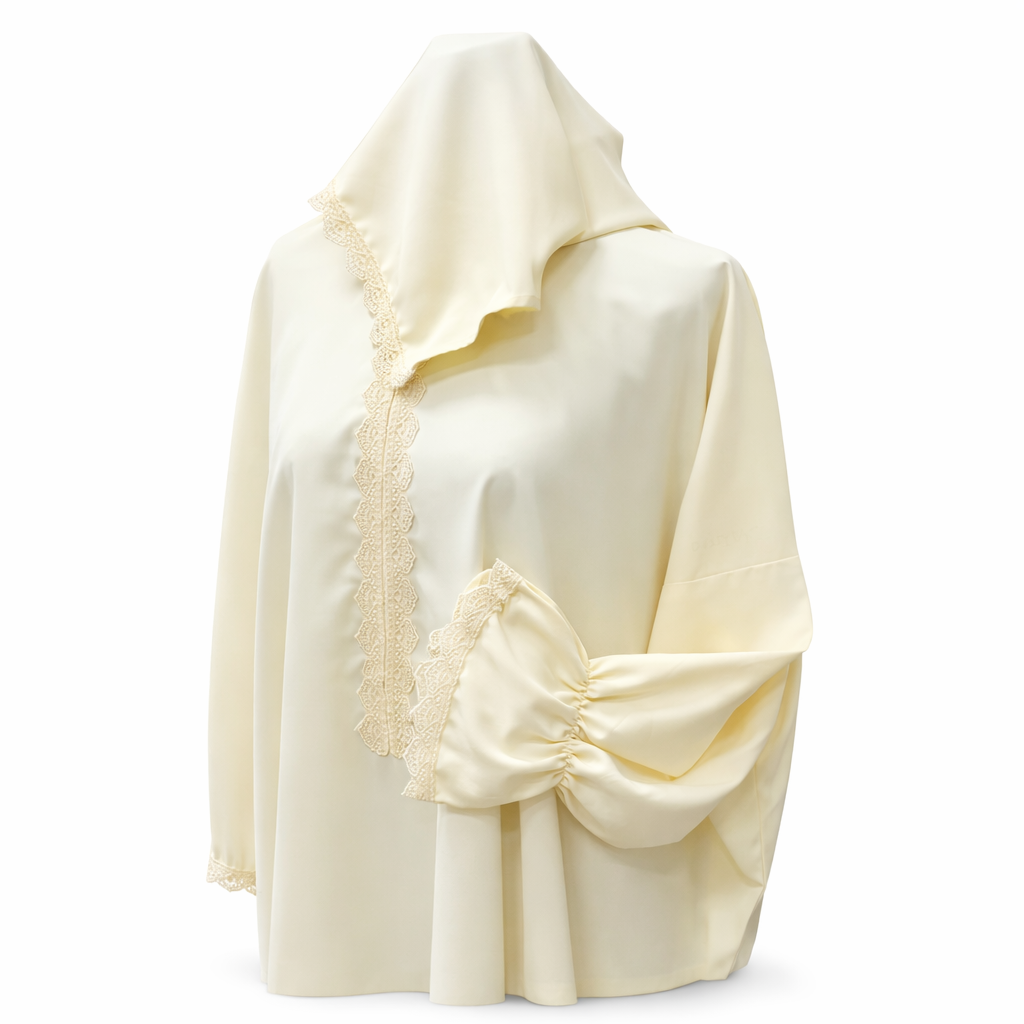 ملابس صلاة راقية و ناعمة باللون البيج ، المقاس يلائم الجميع free size، مقاس محيط الصدر 170سم ، الطول من الكتف 155سم